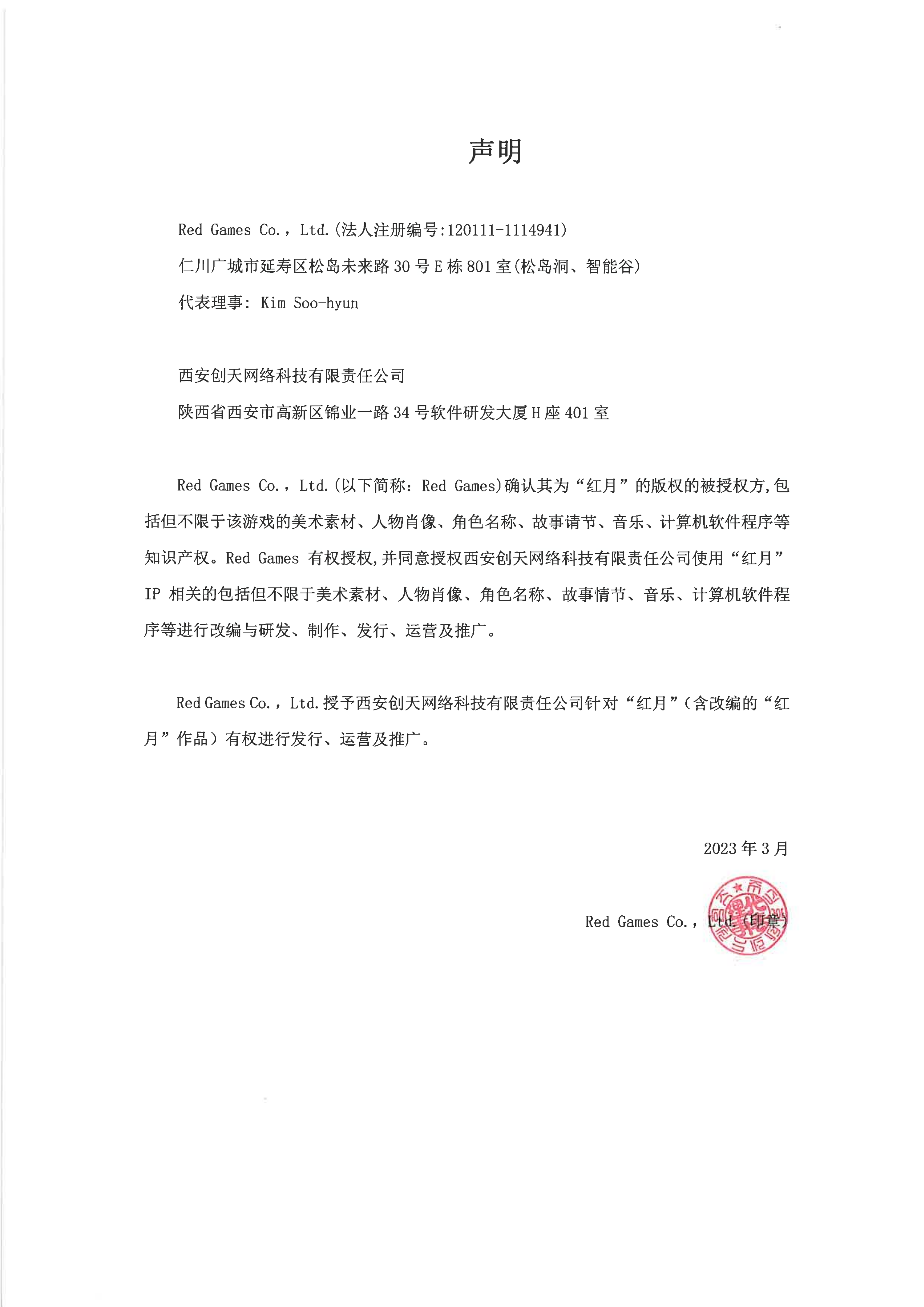 2.Red Games Co., Ltd. 已将《红月》PC在中国大陆地区的相关权利,合法授权予西安创天网络科技有限责任公司。